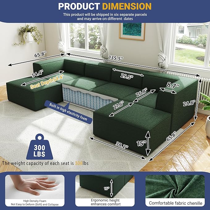 136" 6-Piece Sectional Sofa Modular Couches,L-U-Shaped with Chaise,for Living Room,Compressed Foam No Assembly,for Living Room (2xArmless Corner Ottoman) Fabric Chenille Green