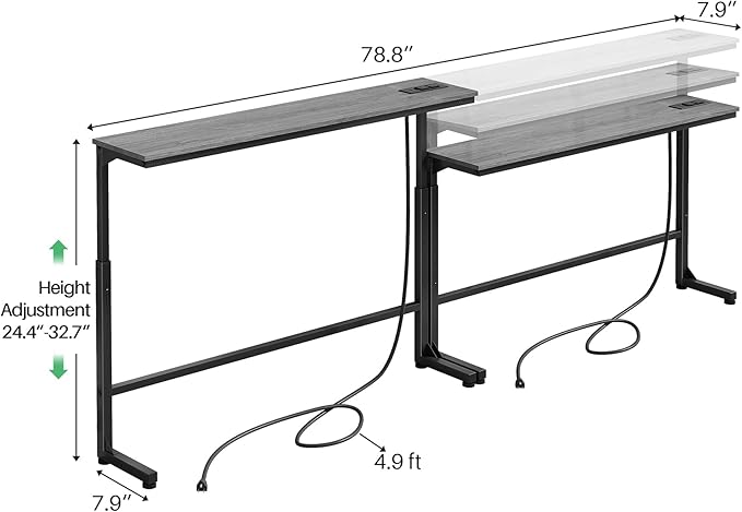 Kitstorack 2-Pack Dark Gray Console Table, 7.9" Deep Panel, Adjustable Height (25"-33") & with 2 Power Outlets, Behind Sofa Couch Table, Use Together or Separately, 79" L