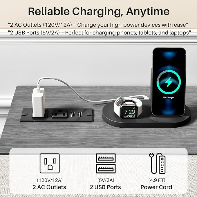 - ✔️Durable and Stable Power Outlets: Equipped with 2 outlets (120V/12A) and 2 USB ports (5V/2A) to meet various charging needs for phones, laptops, tablets, and more. Includes a 4.9ft extended, heavy-duty power cord for added convenience