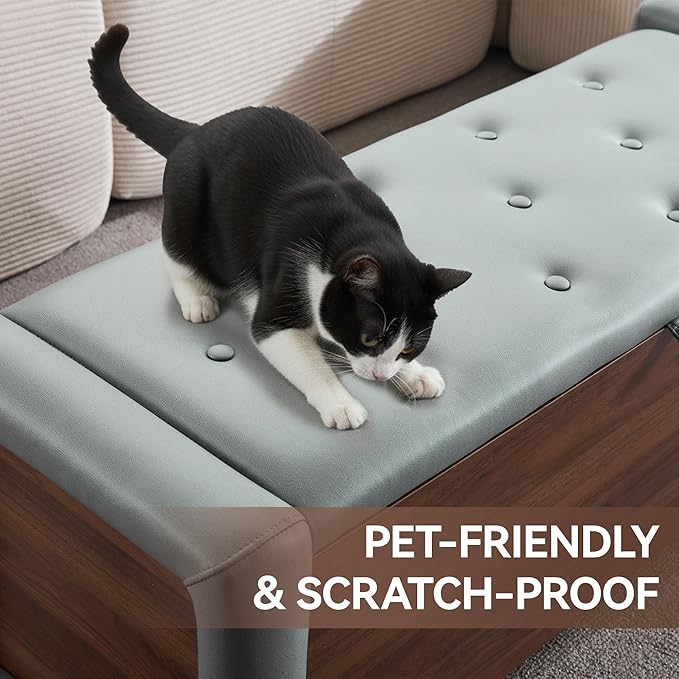 - Elegant & Durable Craftsmanship: Wrapped in smooth, scratch-resistant faux leather with deep button tufting, this upholstered storage bench combines comfort and durability. The wood-grain base adds natural warmth, while the sturdy frame supports up to 400 lbs