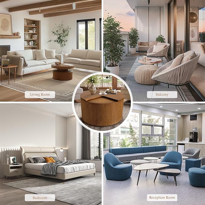 - Spacious Storage Space: This circle wooden coffee table features a spacious 27.16-inch diameter top, providing ample room for daily essentials, keeping them within easy reach. The hollow interior provides a hidden storage space for magazines, books, toys or your coffee table essentials within reach.
