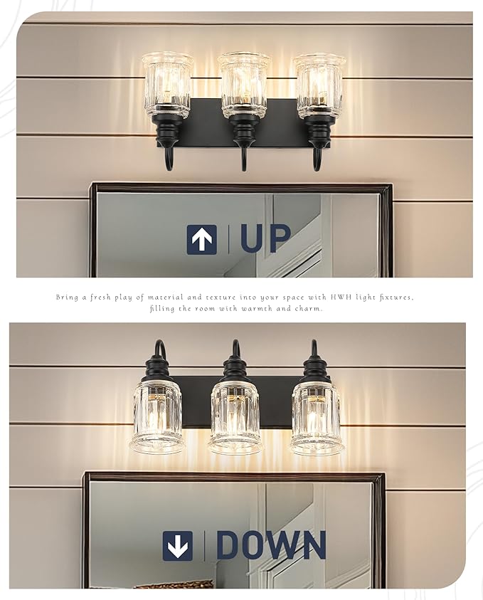 - Enduring: Brighten your bathroom mirror with a high-quality vanity light designed with black finish metal and thickened bell-shaped fluted clear glass shade. It can be mounted up or down to add an elegant atmosphere to your home and bring more brilliance to your life!