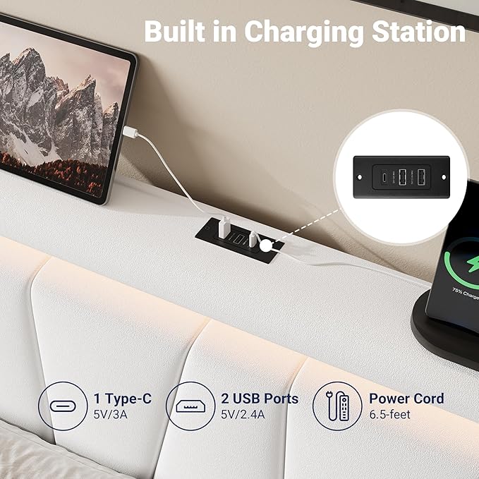 - Ultra-Convenient Charging Station: Never run out of battery again! The headboard of this LED platform bed includes 2 USB ports and 1 Type-C port. Keep your phones, iPads, and other devices powered up and within easy reach