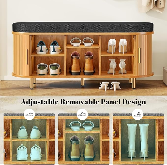 - Smart Space Management: This Storage Shoe Bench features a dual-layer, 6-compartment adjustable compartment system (with removable dividers) for customizable shelf heights. Say goodbye to fixed compartments! Its built-in flexible shelves let you effortlessly tailor each storage layer to accommodate boots, high heels, sneakers, and other shoe types of varying heights. Every season's footwear finds its perfect βhome,β maximizing every inch of cabinet space and boosting storage efficiency by up to 50%