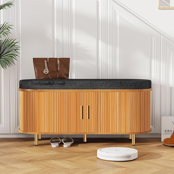 DHH Entryway Bench with Shoe Storage Fluted Shoe Storage Sliding Door and Adjustable Shelf with Cushion,2-Tier Shoe Rack Cabinet for Entryway, Bedroom, Living Room, (Yellow Walnut)
