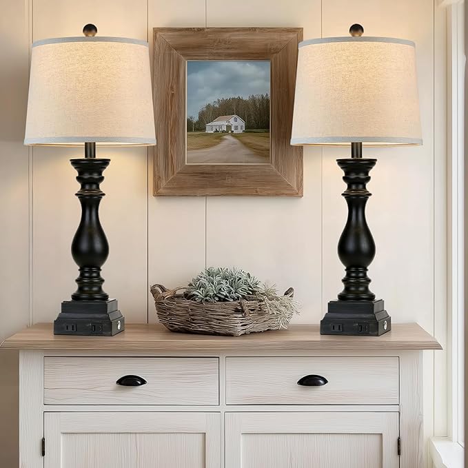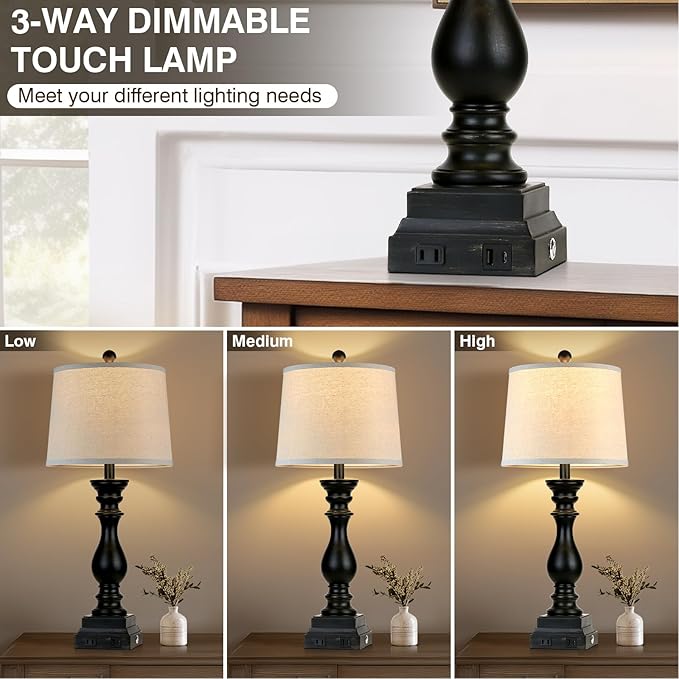 28" Farmhouse Table Lamps Set of 2 with USB C+A Ports and AC Outlet, 3 Way Touch Tall Vintage Bedside Lamp for Living Room, Black Rustic Nightstand Lamp for Bedroom Office