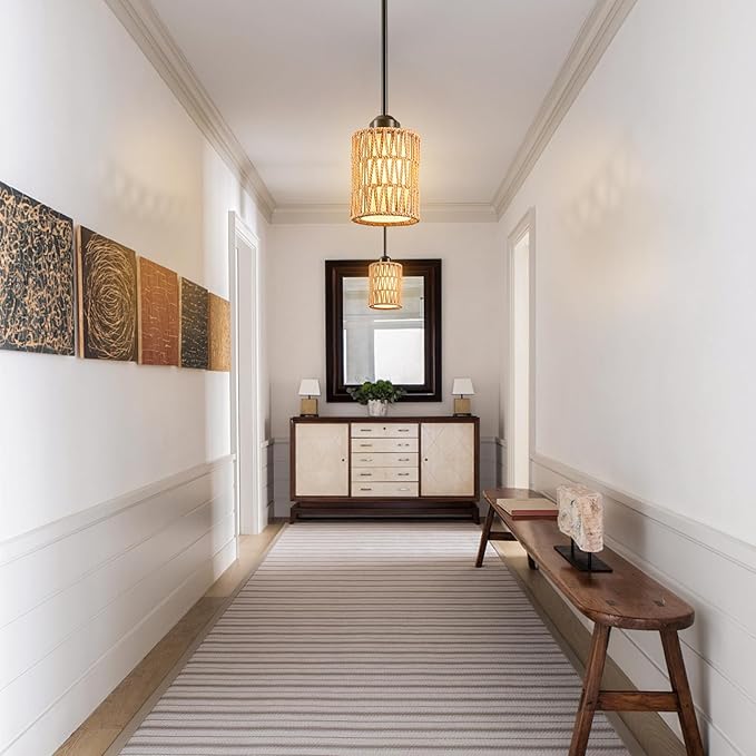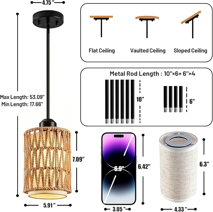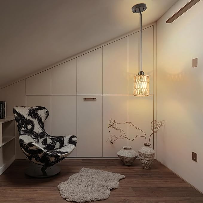 - 【3-in-1 Pendant Light with Dual Shades】This Rattan Pendant Light comes with a lager 7.09"woven & 6.3" linen lampshade, has 3 display effects, the removable lampshade can be freely combined according to your preference. The rattan pendant light blends perfectly with farmhouse, bohemian, vintage and industrial home styles, adding a natural element to your home decor. When the boho pendant light lit, the light from the shade projects a very beautiful pattern on the wall