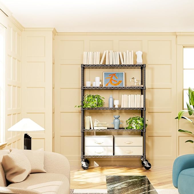 IZEUK 5-Tier Storage Shelving Unit with Wheels, Adjustable Heavy Duty Steel Wire Rack Organizer (Black, 17.7" D x 47.2" W x 76.7" H, 1750 lbs Capacity) for Garage, Kitchen, Office, Laundry, Basement
