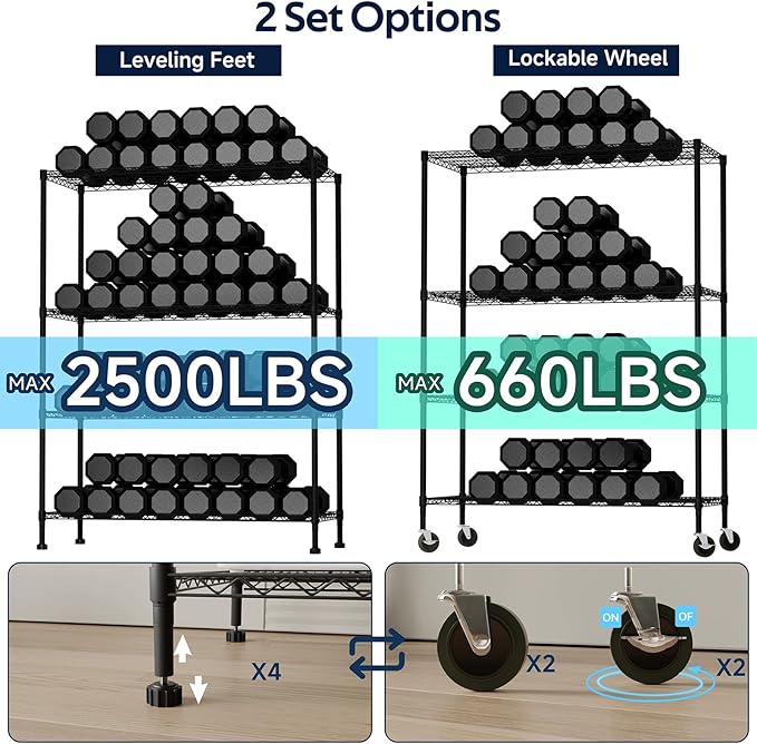 - 2500 LBS Large Capacity Storage: The heavy duty metal storage shelf, Each shelf has a capacity of up to 625 lbs(evenly distributed), with a max load capacity of 2500 lbs total, capable of supporting weightover extended periods, ensuring your items are safely and neatly stored.