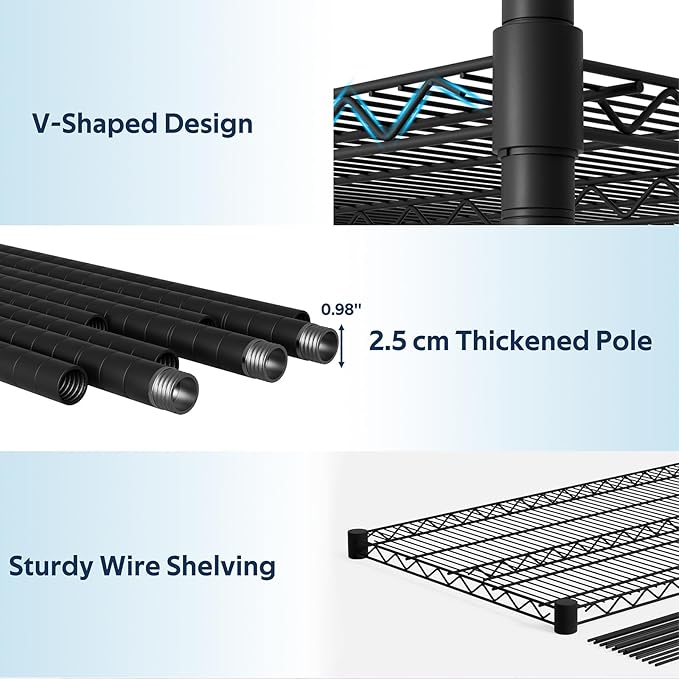- Heavy Duty Construction: Featuring a dense mesh design and V-shaped sidebars, this heavy-duty shelf unit enhances structural strength and load-bearing capacity. The thickened pipes provide stronger support, while the durable coating protects against rust and corrosion.