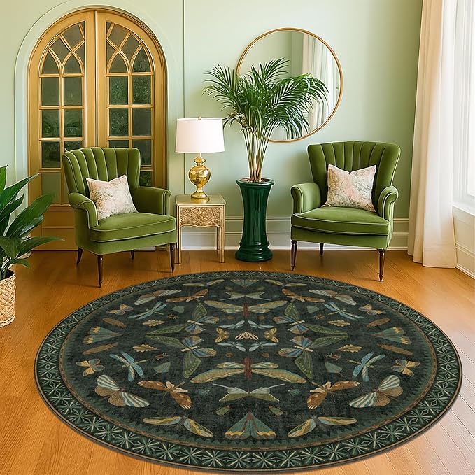 Dark Green Insect 6ft Round Washable Area Rug for Living Room - Non Skid Low Pile & Soft Carpet for Bedroom Beside Bed, Forest Butterfly Design Stain Resistant Home Décor