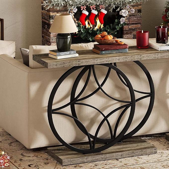 39.4" Entryway Table, Industrial Console Table for Entryway with Anti-Tilt Design, Narrow Wood Accent Sofa Table Behind Couch with Double Circle Base for Hallway, Living Room, Foyer (Industrial Grey)