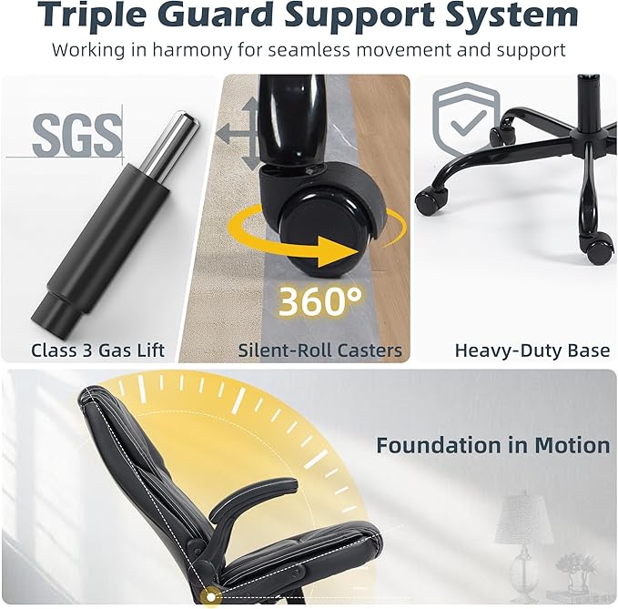 - Heavy-Duty Load Structure: Engineered to support 400lbs with consistent reliability, the office desk chair incorporates SGS-certified Class-3 gas lift technology and reinforced metal base construction. Ultra-quiet 360° casters of our computer chair facilitate smooth mobility across various flooring surfaces while protecting delicate finishes, making them ideal for environments where discreet movement and floor preservation are essential considerations