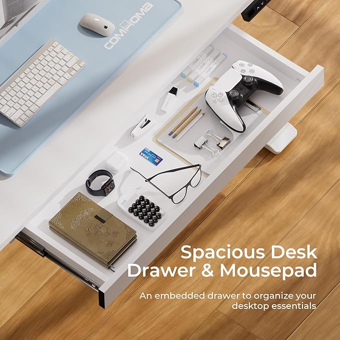 - Ample Storage Space: A convenient pull-out drawer embedded in the desktop provides seamless integrated storage space for your home office supplies. The white standing desk top shelves can hold files, books, and provide ample space for writing, paperwork, and other home office activities. Additionally, 2 versatile hooks offer additional storage convenience