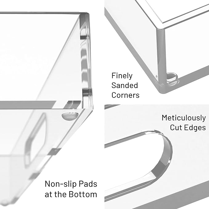 - SECURE & STABLE: Our acrylic tray is designed with silicone anti-slip pads to protect surfaces from scratches and provide stability. With these pads in place, the tray remains steady on various countertops, preventing any sliding or movement.