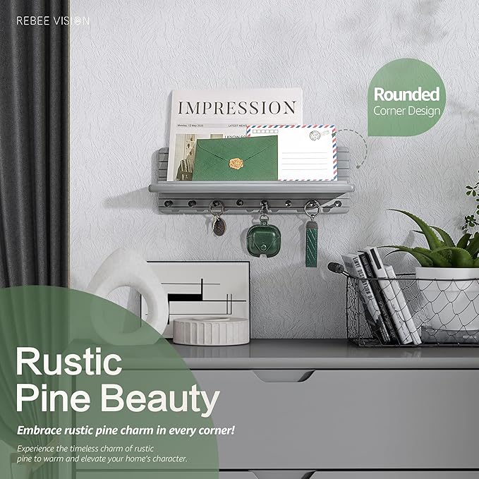 - [QUALITY CRAFTSMANSHIP] Simple yet stunning! Made from premium pine wood and finished in a trendy gray shade, this key rack brings a subtle farmhouse feel with a modern edge. Whether your style is rustic, contemporary, or somewhere in between, this wall organizer adds a perfect pop of clean, timeless elegance.
