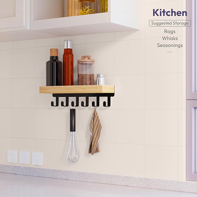 - [Mini Shelf for Daily Essentials]: This wall-mounted key holder includes 6 sturdy hooks to hang keys, lanyards, or pet leashes, plus a small top platform to hold your everyday carry. Use it to keep mail, postcards, wallets, or glasses organized and within reach as you walk in or out. A simple addition that adds real function to your entry space without bulk