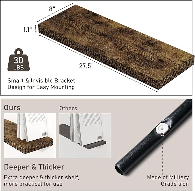 Floating Shelves for Wall, 28 Inch Floating Shelves Set of 2, Wall Mounted Rustic Wood Shelf for Bathroom, Living Room, Bedroom and Kitchen, Hanging Shelf for Storage, Books, Home Decor, Rustic Brown