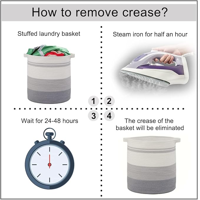 - Washable Large Basket: This large basket can be washed by hand or machine with gentle detergent. If machine washed, please put them into a laundry bag. NOTE: These cotton rope baskets are folded when shipping, but it will turn back to its elegant shape quickly if you fill it with some towels or clothing, and iron is great idea to remove the creases