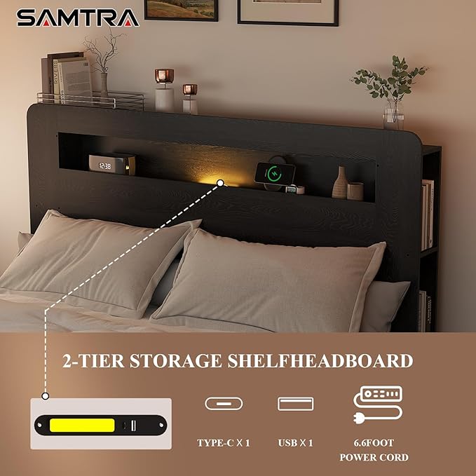 - Bookshelf Storage & Storage Space Under: The bed frame designs with Bookshelf, and Storage Headboard with Led Lights. The under-bed storage space of this rustic bed frame can improve the utilization of bedroom space, allowing you to better store items while making your bedroom look clean and tidy.