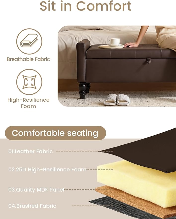 - Easy Assembly & Professional Support: Assembling this storage bench for bedroom is very simple, no additional tools are needed, just install the armrest and bench legs. Should any questions arise, our dedicated customer service team is available around the clock and strives to respond within 24 hours