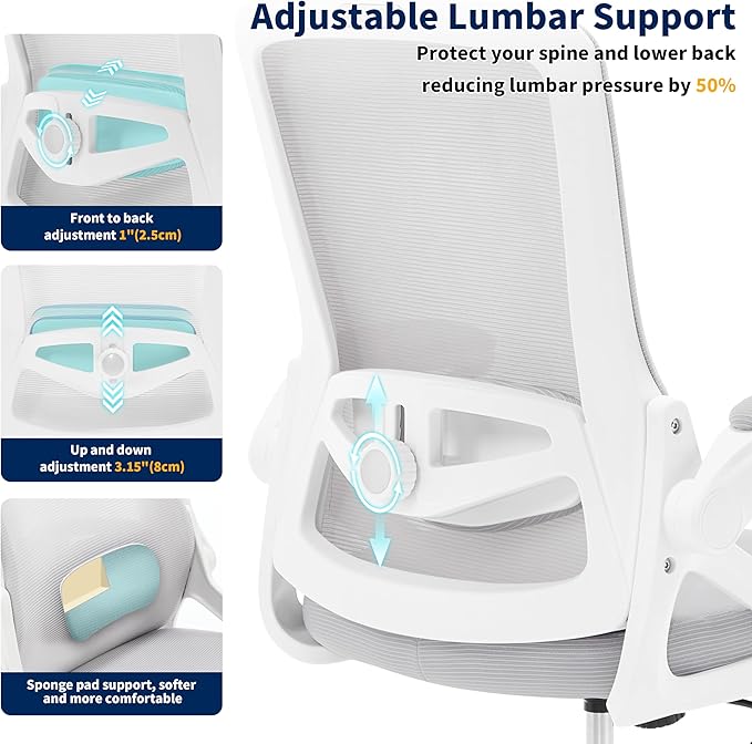 - 【Adjustable Lumbar Support】Our computer chair's lumbar support system adjusts 1" forward and backward and 3.15" up and down, perfectly conforming to the natural curve of the lower back and spine. This design protects neck and spinal health while enhancing comfort (adjustable to accommodate different heights and body types, suitable for users of varying builds)