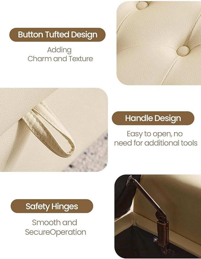 - Multi-Functional & Easy to Clean: Use this Multi functional bedroom storage bench as a seat, a footrest, or a hidden storage bench—it adapts to your needs effortlessly. The premium Faux leather surface resists stains and wipes clean in seconds with a damp cloth, making maintenance quick and simple. Its timeless look fits seamlessly into your home as both a functional and decorative upholstered storage bench