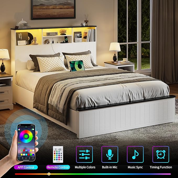 - 【Adjustable LED Light Strip】 The bed frame queen size features an LED strip with dimmable brightness, a microphone, music sync, and timer modes. Control via app, remote, or manual switch makes this queen size bed frame effortless to operate. Great for creating a cozy bedroom ambiance