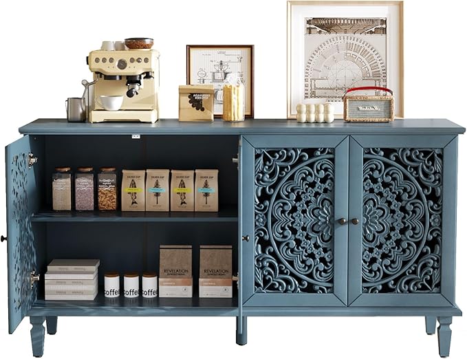 Retro 60'' Large Storage Cabinet Sideboard with 4 Hollow-Carved Doors and Adjustable Shelves, Acacia Wood Vintage Entryway Console Table TV Stand for Living Room Dining Room (Antique Blue-LK)