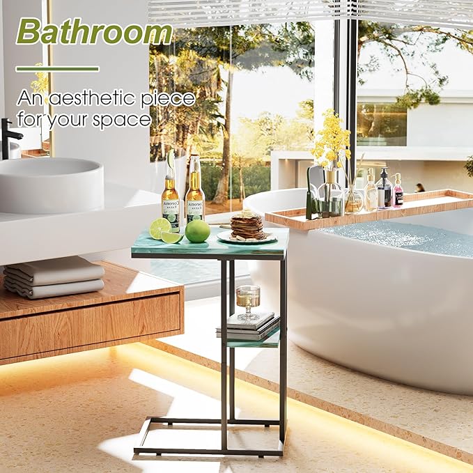 C Shaped End Side Table, Couch Sofa Table for Small Space, Snack Table with Metal Frame, TV Tray Table for Bed, Living Room, Bedroom, Bedside(Sea Blue)