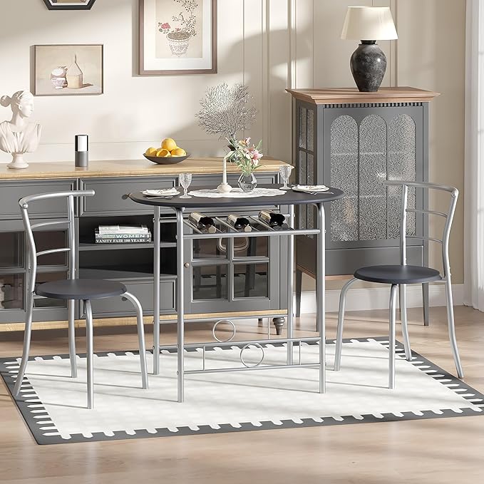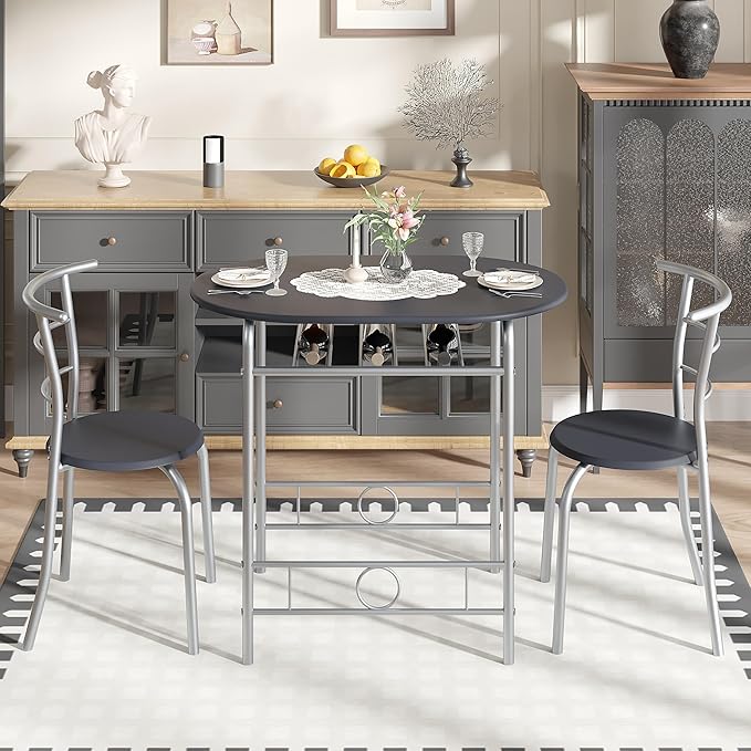 VECELO 3-Piece Dining Table Set for Kitchen Breakfast Nook, Wood Grain Oval Tabletop and Metal Frame with Built-in Wine Rack, for Small Spaces, Black & Silver