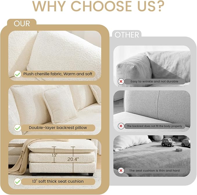 - Chenille Fabric & Removable Washable Cover: This modular Cloud Sofa features fabric with longer, denser pile than standard chenille, instantly elevating your home's sophistication and comfort. Its soft, skin-friendly texture delivers an exceptional sitting and reclining experience. The thick, long-pile construction provides enhanced warmth, making it ideal for households with children and pets. The sofa's cushions and pillows are removable for easy washing, simplifying daily maintenance