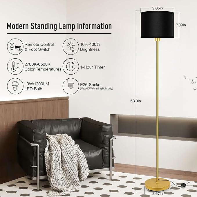- Stepless Dimmable Floor Lamp, Create Personalized Lighting: This gold floor lamp with remote control includes a 10W/1200LM LED bulb (lifespan≥50,000h), capable of dimming function from 10%-100% brightness, color temperature from 2700K-6500K, suitable for warm white, natural white, daylight and cool white; It can be used according to the scene need to create different atmospheres and visual effects, perfect for use as a living room corner floor lamp, floor lamp for bedroom, or office floor lamp.