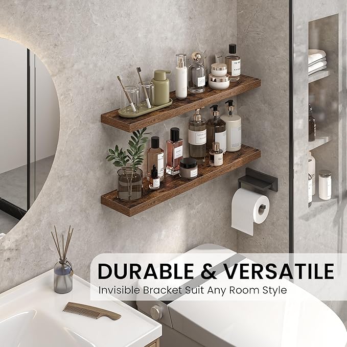 - 【Floating Design with Hidden Brackets】Crafted from durable engineered wood, these shelves feature a discreet mounting system that keeps hardware completely out of sight for a clean,streamlined look. Each shelf easily holds up to 30 lbs, making them perfect for displaying books,organizing toiletries,or showcasing your favorite decor items.