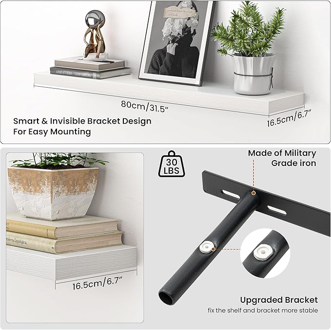 - 【Modern and simple style】Our 31.5in white floating shelves are designed based on modern and simple style, focusing on functionality and aesthetics. It can perfectly match any style of wall and room. Whether it is to display decorations or increase storage space, this simple style wall shelf can meet your needs and add beauty to your life.