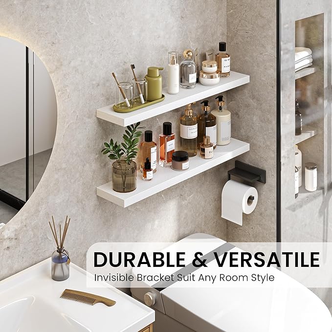 - 【Floating Design with Hidden Brackets】Crafted from durable engineered wood, these shelves feature a discreet mounting system that keeps hardware completely out of sight for a clean,streamlined look. Each shelf easily holds up to 30 lbs, making them perfect for displaying books,organizing toiletries,or showcasing your favorite decor items.