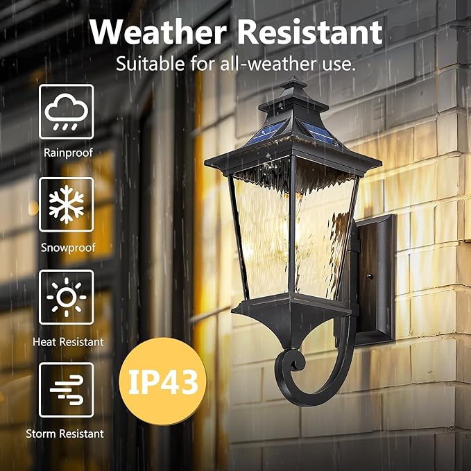 - Weather Resistant: With a waterproof rating of IP43, this solar wall mounted light is made of durable aluminum and water ripple glass in a black finish, suitable for all-weather use. Comes with a pole and a pier mount adapter and a 2700K LED light bulb(Max 4W). NOTE: Light source is INCLUDED and Not compatible with other LED bulbs. ONLY suitable for the ST64 LED bulbs - Asin: B0F2HWRPP9.