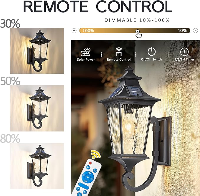 - Convenient Remote Control: Comes with a remote control, this outside wall lamp automatically turns on at dusk and off at dawn. You can set timers for 3/5/8 hours and adjust brightness level from 10% to 100%, with additional options at 30%, 50% or 80%.