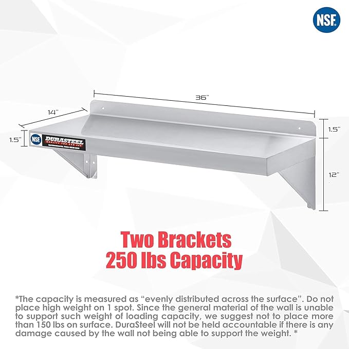 - Premium Construction: Made with 18-gauge stainless steel. Heavy duty commercial grade shelving supports up to 250 lbs. Perfect stainless steel shelf for kitchen, garage storage shelves, or utility racks. Durable metal wall shelf for long-term use