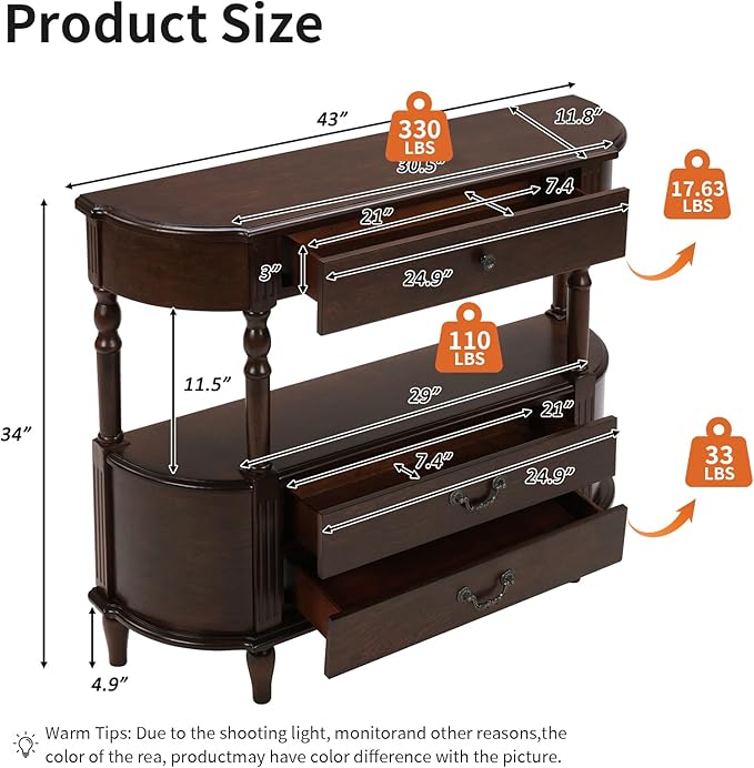 - Excellent Structure: Produced in Vietnam,this half-moon console table has a sturdy construction.The drawer frames and table legs are made of solid pine wood.The tabletop and shelf are veneered with birch wood. Exceptional Load Capacity: Table Top: 330 lbs; Lower Shelf: 110 lbs; Single Upper Drawer: 17.63 lbs; Single Lower Drawer: 33 lbs, ensuring outstanding stability.