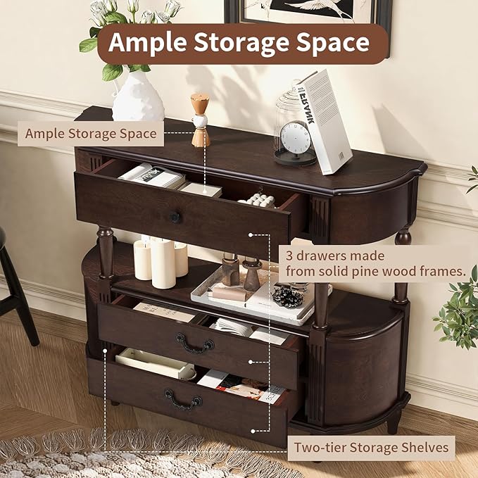 HMFULE Solid Wood Retro Curved Console Table, 43" Half Moon Console Table Sofa Table Entryway Table with 3 Drawers Open Shelf Pine Roman Legs Curved Corners for Living Room,Entryway,Hallway,Espresso