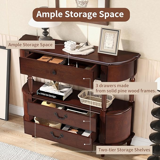 HMFULE Solid Wood Retro Curved Console Table, 43" Half Moon Console Table Sofa Table Entryway Table with 3 Drawers Open Shelf Pine Roman Legs Curved Corners for Living Room,Entryway,Hallway,Cherry