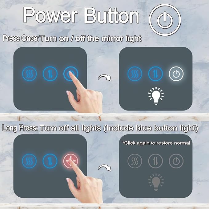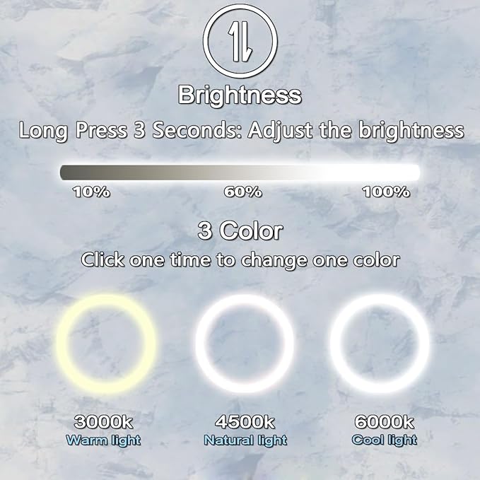 - 👆【Adjustable Brightness & 3 Colors】The light of this round bathroom smart mirror is dimmable, the button will be blue in a dark environment. Simply touch the round button for 3 seconds to change brightness. Meet your habits with 3 colors light, warm light /day light /cold light that will give you a strong light for personal care or a gentle light as a ambient light. The anti-fog is separately controlled by a button, turn on/off, it is the high quality life choice with no more foggy mirrors.