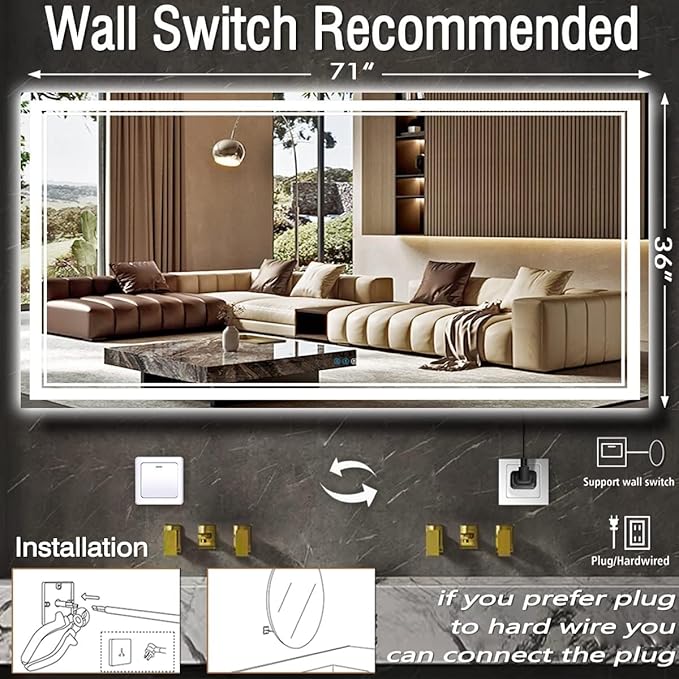 - 🛠【Freely Choose Hardwired or Plug & Power-off Light Memory】Each mirror comes with a standard two-prong plug that suitable for a wide voltage range of 100V to 240V.Or you can choose hardwiring, connecting to your switch on wall.The mirror has light memory function. When it is turned on again, it will display the brightness and color temperature when it was turned off last time.Coming with accessories bag to hanging the mirror, just reading the instruction carefully.Easy and safe to install.