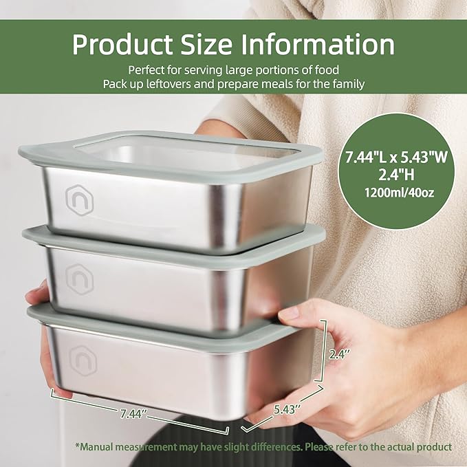 Meal Prep Containers, 3Pack 40oz/1200ml Glass Food Storage Containers with Leak Proof Airtight Lids, Stainless Steel Bento Lunch Boxes, Kitchen Storage for Oven, Freezer, Dishwasher (Set of B)