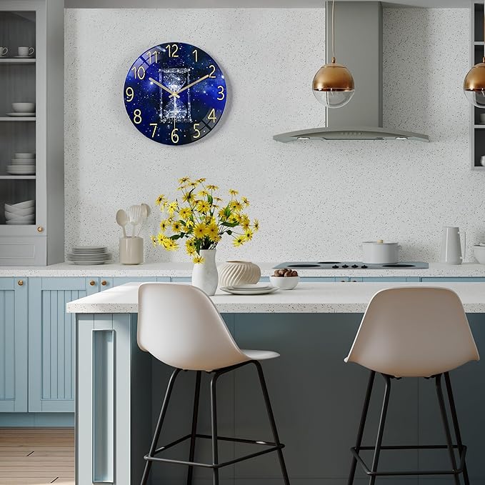 - Novelty & Unique Design: This artistic clock features galaxy with hourglass pattern. The golden Arabic numbers and clock hands and creative blue glass dial will easily attract people's attention.