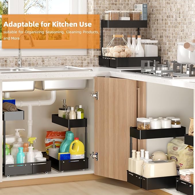 2Packs Under Sink Organizer with Adjustable Height and Width, Under Cabinet Organizer to Tidy, Sturdy Metal Design for Kitchen and Bathroom