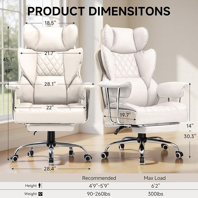 COMHOMA Big and Tall Office Chair, High Back Leather Gaming Chair with Footrest, Executive Ergonomic Office Chairs with Pocket Spring Lumbar Support and with Outward Fixed Soft Armrests