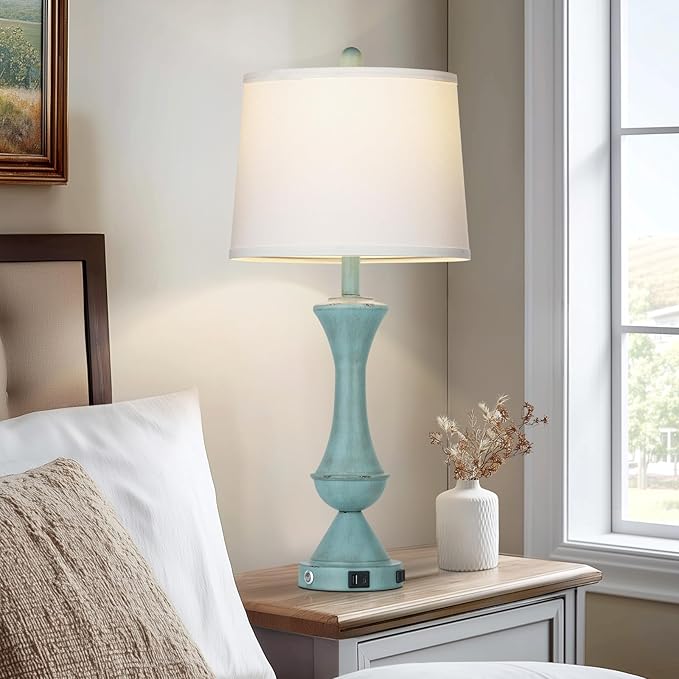 - 【Included 2 LED Bulbs】Say goodbye to the hassle of finding compatible bulbs! Comes with 2 E26 LED bulbs with 25,000 hour lifespan, more energy-saving and durable. Blue bedside table lamp with natural linen lampshade softens the light to protect your eyesight
