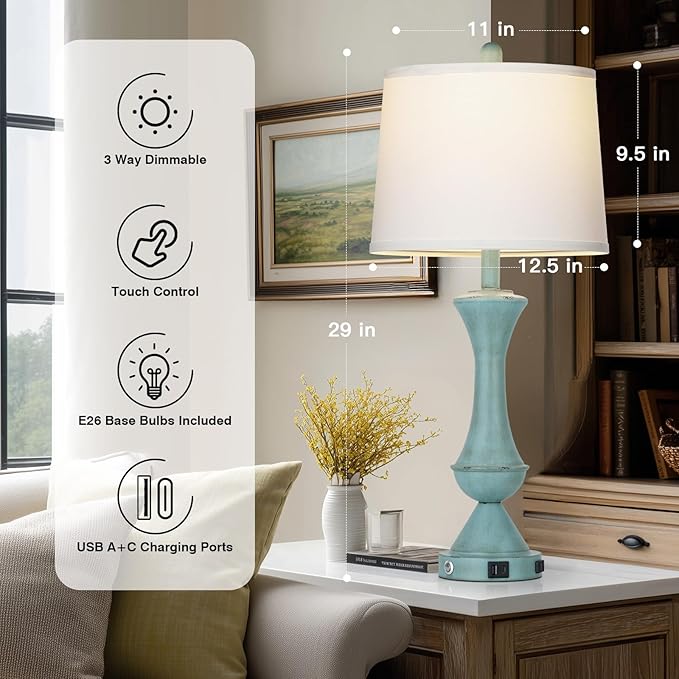 29" Tall Blue Table Lamps Set of 2 for Living Room, Touch Control Bedroom Lamps for Nightstand, 3-Way Dimmable Bedside Lamp with USB A+C Port &AC Outlets(2 LED Bulbs Included)